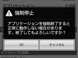 「はい」を選択すると右のandroid携帯の設定画面が立ち上がるので上部の「強制停止」ボタンをクリックします。