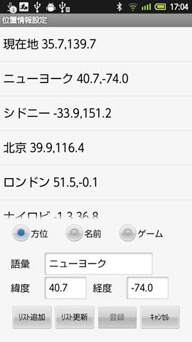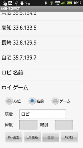 タッチした一覧の項目の語彙、緯度、経度が下の入力フィールドに表示されます。